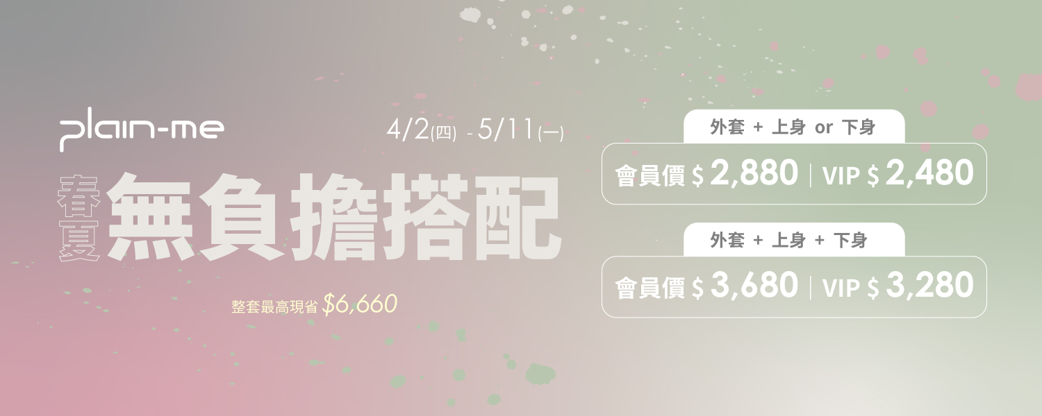 新品防曬防潑水經典熱賣款hook推薦 plain-me YOBI全機能抗UV防曬外套2.0 open 建議售價 NT$ 1980 會員價 NT$ 1881 [5%OFF] 灰藍杏灰泡泡糖皇家藍-預購清透灰紫-預購黑濃情熱巧-預購鐵灰卡其奶油XSSML 請選擇數量12345 加入購物車 限時優惠經典熱賣款 plain-me 吸濕排汗打褶短褲 open 售價 NT$ 1880 特價 NT$ 640 [66%OFF] 卡其軍綠深藍黑SMLXL 請選擇數量123 加入購物車 經典熱賣款 plain-me EASY西料短褲 open 建議售價 NT$ 1880 會員價 NT$ 1786 [5%OFF] 淺灰棕鐵灰SML 請選擇數量12345 加入購物車 限時優惠經典熱賣款 plain-me 水洗棉質腰帶繭型短褲 open 建議售價 NT$ 1880 特價 NT$ 1429 [24%OFF] 灰卡其泥灰軍綠深藍黑SML 請選擇數量1234 加入購物車 限時優惠 plain-me Billy Pants 比例神褲 open 售價 NT$ 1880 特價 NT$ 988 [47%OFF] 黑藏青灰棕深灰S-30腰M-32腰L-34腰XL-36腰 請選擇數量12345 加入購物車 防曬防潑水鬆身版型經典熱賣款 plain-me P Logo全機能抗UV夾克外套 open 售價 NT$ 2080 會員價 NT$ 1976 [5%OFF] 杏灰鐵灰黑卡其灰藍XSSML 請選擇數量12345 加入購物車 防曬防潑水超寬版型經典熱賣款 plain-me Oversize 和風抗UV外套 open 建議售價 NT$ 2080 會員價 NT$ 1976 [5%OFF] 深灰淺灰黑ML 請選擇數量1 加入購物車 新品涼感一般版型經典熱賣款 plain-me 涼感重磅好感短袖TEE 2.0 open 建議售價 NT$ 1480 會員價 NT$ 1406 [5%OFF] 深月藍白冰川灰亞麻綠果凍綠炙紅橘恬靜紫黑微風藍鐵鏽灰XSM 請選擇數量12 加入購物車 補貨防曬涼感鬆身版型經典熱賣款 plain-me 小P社長-防曬涼感短袖TEE 2.0 open 建議售價 NT$ 1480 會員價 NT$ 1406 [5%OFF] 寶藍黑淺麻灰淺粉灰霧藍宇宙紫白奶茶亮綠SMLXL 請選擇數量12 加入購物車 補貨防曬涼感一般版型經典熱賣款 plain-me PLAIN多色logo短袖TEE open 建議售價 NT$ 1480 會員價 NT$ 1406 [5%OFF] 奶茶白咖啡黃綠寶藍櫻花粉SML 請選擇數量12 加入購物車 寬身版型經典熱賣款 plain-me 小P社長-抗皺挺版短袖TEE open 建議售價 NT$ 1480 會員價 NT$ 1406 [5%OFF] 白冰川灰ML 請選擇數量1 加入購物車 補貨一般版型經典熱賣款 plain-me 水洗寬版刺繡短袖TEE open 建議售價 NT$ 1880 會員價 NT$ 1880 黑巧咖杏灰海岩白碳灰暮光紫梨黃霧靛藍松綠MLXL 請選擇數量12345 加入購物車 寬身版型 plain-me 小P社長-條紋短袖TEE open 建議售價 NT$ 1680 會員價 NT$ 1596 [5%OFF] 森林綠卡其黑XSSM 請選擇數量1 加入購物車 限時優惠防潑水經典熱賣款 plain-me CITY BOY防潑水彈性舒適百搭神褲 open 建議售價 NT$ 2080 特價 NT$ 1581 [24%OFF] 麻花卡其深灰黑淺灰SMLXL 請選擇數量12345 加入購物車 限時優惠經典熱賣款 plain-me Billy Pants plus 全長比例神褲 open 售價 NT$ 2480 特價 NT$ 988 [60%OFF] 灰深灰棕黑藏青32腰-M34腰-L36腰-XL 請選擇數量12345 加入購物車 plain-me PM旅行小包 open 建議售價 NT$ 1280 會員價 NT$ 1080 [16%OFF] 卡其黑磨石灰紅藍綠霧藍橘紫芥黃松柏綠黑曜白珊瑚橘寶藍淺紫湖水綠午夜藍初戀粉F 請選擇數量12345 加入購物車 補貨防潑水經典熱賣款 plain-me PM旅行郵差包 open 售價 NT$ 1680 會員價 NT$ 1596 [5%OFF] 卡其海藍黑F 請選擇數量12345 加入購物車 plain-me PM大容量旅行小包 open 建議售價 NT$ 1480 會員價 NT$ 1280 [14%OFF] 卡其藍灰粉湖水綠寶藏藍軍綠奶油復古紅砂礫黑F 請選擇數量1 加入購物車 plain-me 防潑水拼接水桶包 (中) open 建議售價 NT$ 1480 會員價 NT$ 1280 [14%OFF] 石板藍嫩芽綠微醺粉芋香紫灰F 請選擇數量12345 加入購物車 plain-me 拼接迷你水桶包 open 售價 NT$ 1380 會員價 NT$ 1080 [22%OFF] 灰F 請選擇數量1 加入購物車 plain-me 尼龍光澤旅行小包 open 售價 NT$ 1480 會員價 NT$ 1280 [14%OFF] 黑深藍銅綠F 請選擇數量12 加入購物車 plain-me 防潑水水桶包 (中) open 售價 NT$ 1480 會員價 NT$ 1280 [14%OFF] 灰藍鐵灰黑卡其F 請選擇數量12345 加入購物車 plain-me PM旅行小包-丹寧款 open 售價 NT$ 1680 會員價 NT$ 1480 [12%OFF] 水洗灰原胚白水洗藍F 請選擇數量1 加入購物車 限時優惠補貨防潑水經典熱賣款 plain-me 寬帶雲朵中型半月包 open 售價 NT$ 1280 特價 NT$ 890 [30%OFF] 棕蔚藍F 請選擇數量12345 加入購物車 限時優惠補貨 plain-me 寬帶雲朵小型半月包 open 售價 NT$ 1080 特價 NT$ 790 [27%OFF] 礦綠檸檬黃寶石綠淺灰黑嫩紫磚橘F 請選擇數量12345 加入購物車 限時優惠補貨鬆身版型 plain-me 小P社長logo多色長袖TEE open 建議售價 NT$ 1680 會員價 NT$ 1596 深綠礦藍白宇宙紫淺麻灰黑亞麻綠XSSMLXL 請選擇數量12345 加入購物車 嘖嘖募資破400萬 plain-me ComboGo 自由型後背包 19L open 建議售價 NT$ 2880 會員價 NT$ 2580 [10%OFF] 黑鐵灰卡其F 請選擇數量12345 加入購物車 限時優惠寬身版型 plain-me TABI [旅] 世界走輕旅防潑水機能外套 open 建議售價 NT$ 2880 特價 NT$ 2189 [24%OFF] 黑灰棕午夜藍卡其晚霞橘淺灰深礦綠SML 請選擇數量12345 加入購物車 限時優惠補貨防潑水經典熱賣款 plain-me 第二代升級-PM旅行後背包 19L open 建議售價 NT$ 2480 會員價 NT$ 2356 黑銀河灰風暴棕卡其星夜灰F 請選擇數量12345 加入購物車 限時優惠一般版型經典熱賣款 plain-me 重磅修身好感長Tee open 建議售價 NT$ 1880 會員價 NT$ 1786 白冰川灰亞麻綠深月藍黑鐵鏽灰MLXLXXL 請選擇數量12345 加入購物車 補貨寬身版型 plain-me 寬版刺繡水洗長TEE open 建議售價 NT$ 2080 會員價 NT$ 2080 碳灰杏灰松綠海岩白黑巧咖時髦橘SML 請選擇數量12 加入購物車 限時優惠經典熱賣款 plain-me LOKA 吸濕排汗修身長褲 open 售價 NT$ 2280 特價 NT$ 988 [57%OFF] 深藍軍綠卡其